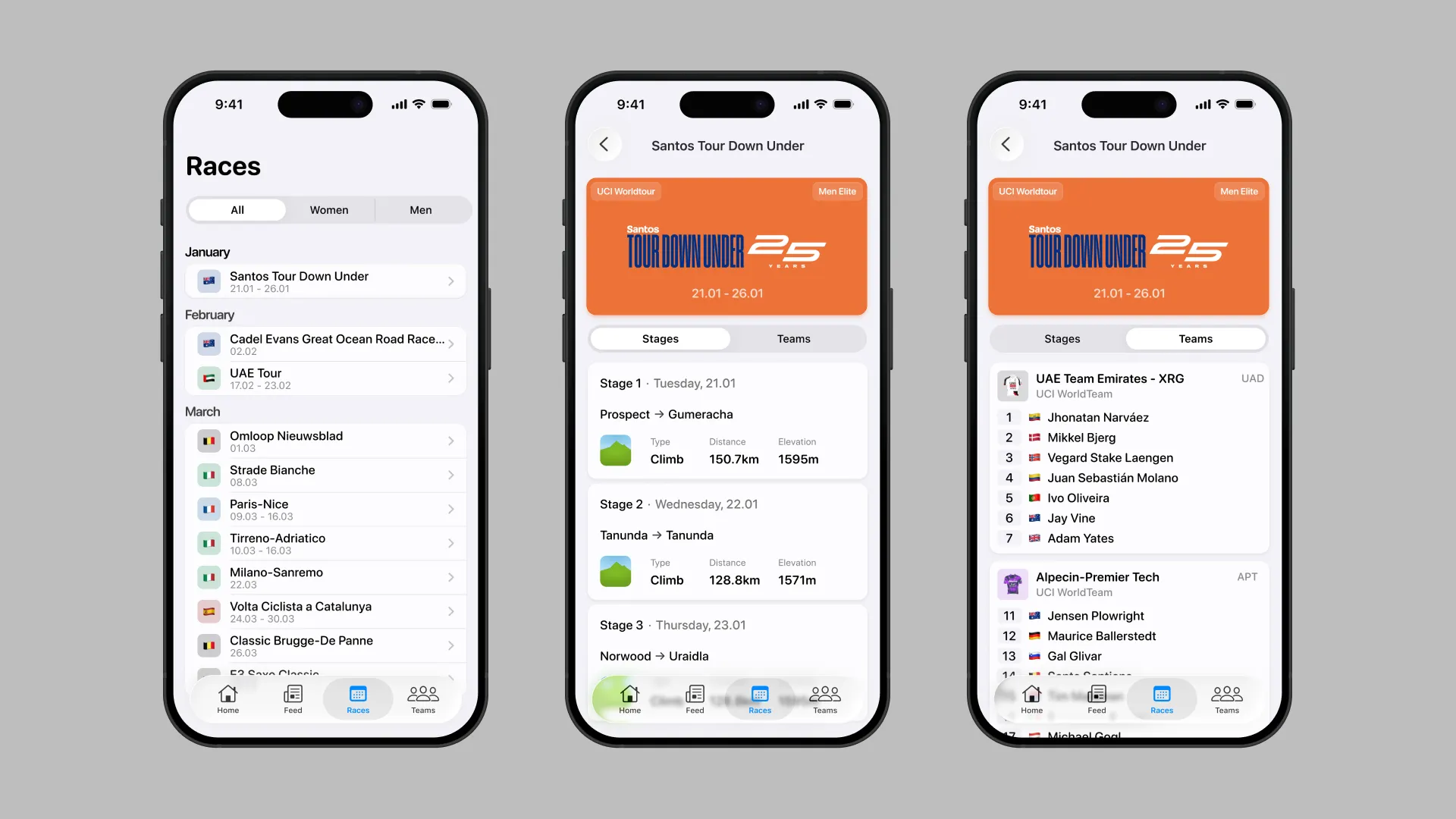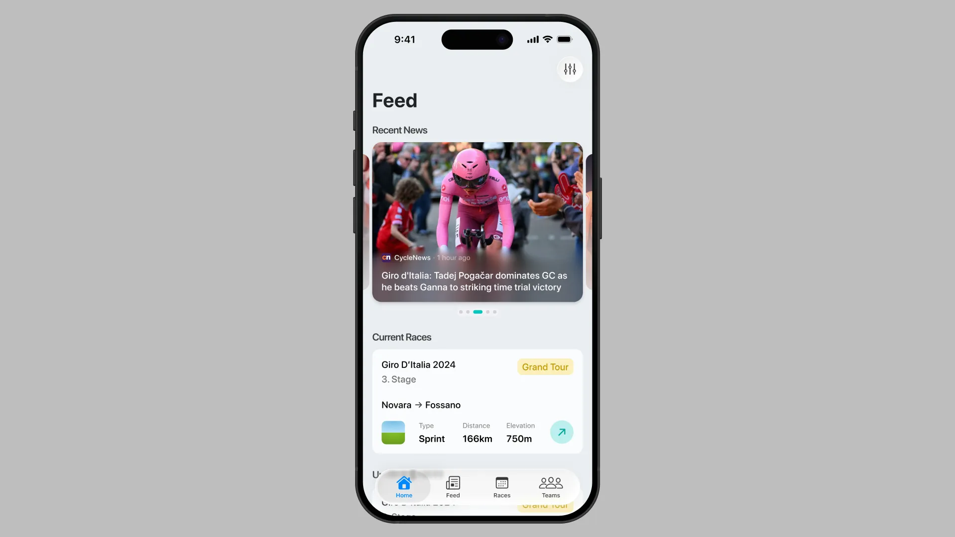 Podium is the result of me discovering my passion for road cycling back in 2023. It quickly became my favorite hobby to be out on the road, in nature, discovering new routes, climbing up mountains, and pushing myself to new limits. As much as I enjoy to be on the cycle myself, I developed the same passion to watch professionals achieving the impossible, riding throughout three weeks covering over 3,500 kilometers. Therefore, I decided to build my own app to stay up-to-date with the swift scene of professional road cycling, a space where I can read news, get an overview of the races happening within a year, and the teams and riders taking part in those.