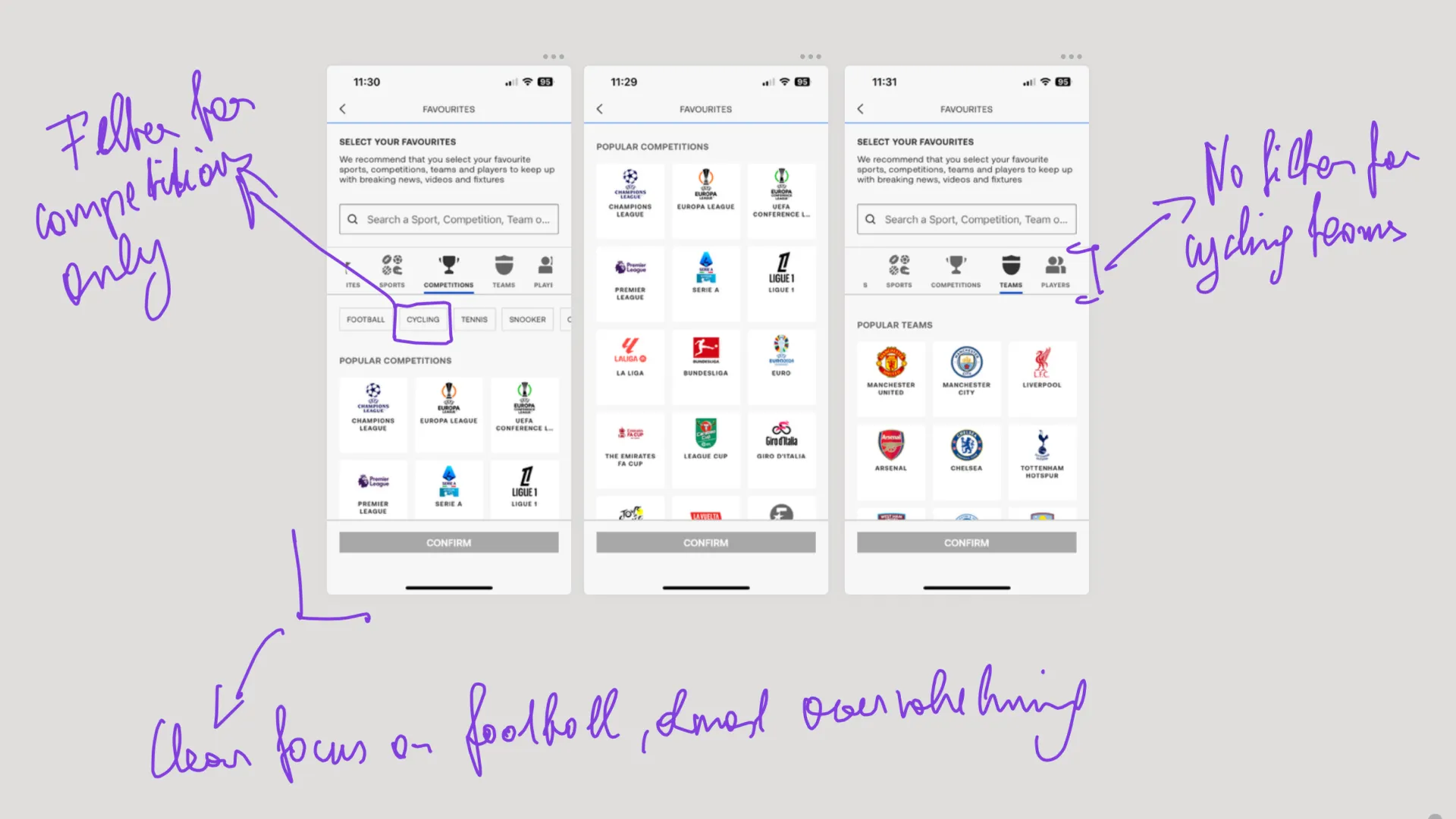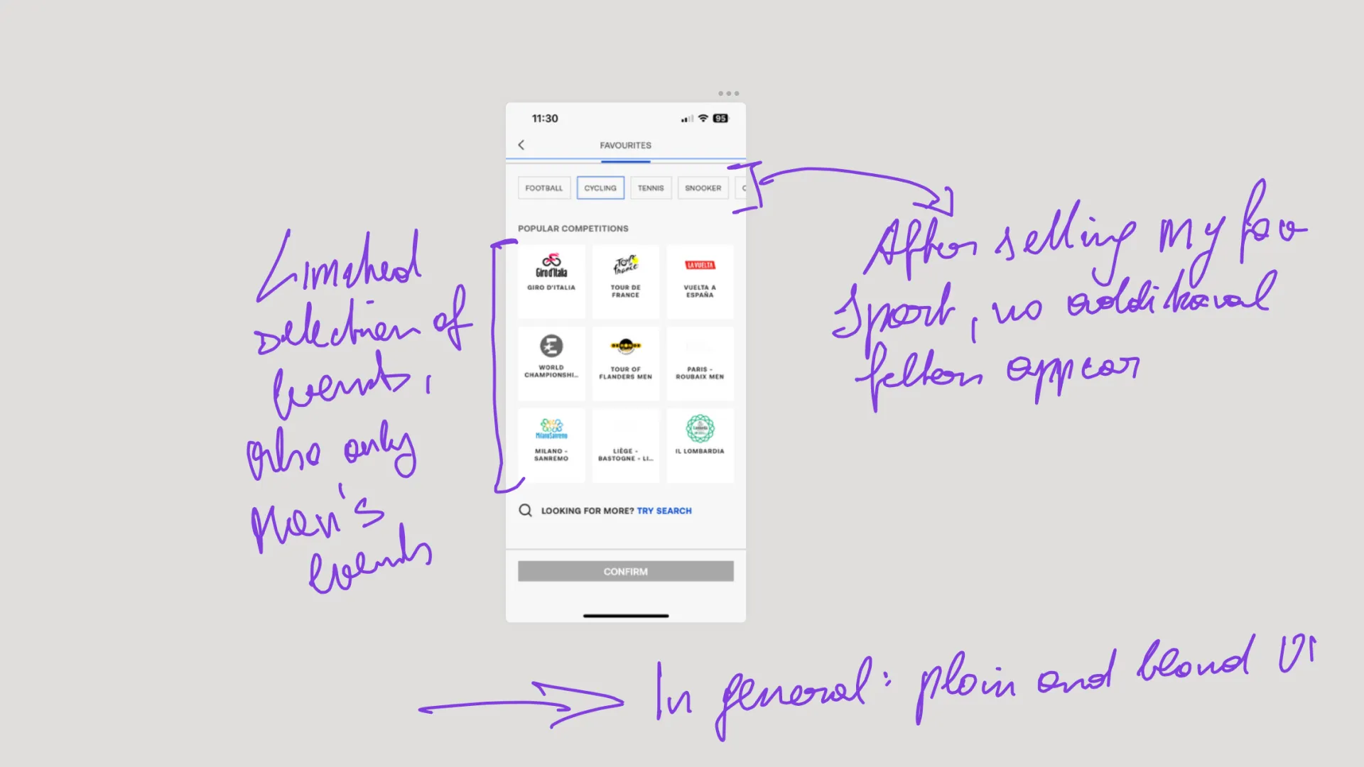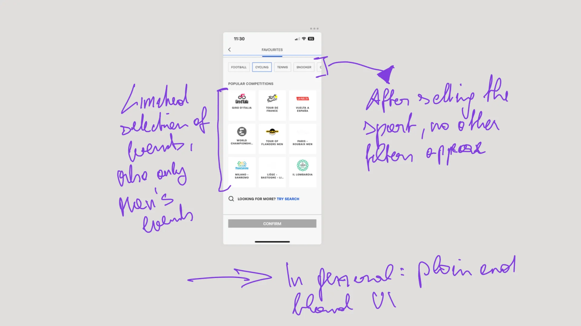 Frustrated by the lack of a cohesive, user-friendly cycling app, I dove into the market to understand what was missing. I tested the official Grand Tour apps, Eurosport, Tour Tracker, and Cyclingoo—each falling short in design, customization, or usability. From outdated interfaces and fragmented experiences to overwhelming ads and ignored women’s races, the gaps were clear: cycling fans deserved better. This research not only revealed the flaws in existing solutions but also defined the opportunity to design an app that prioritizes clarity, personalization, and joy for every ride.