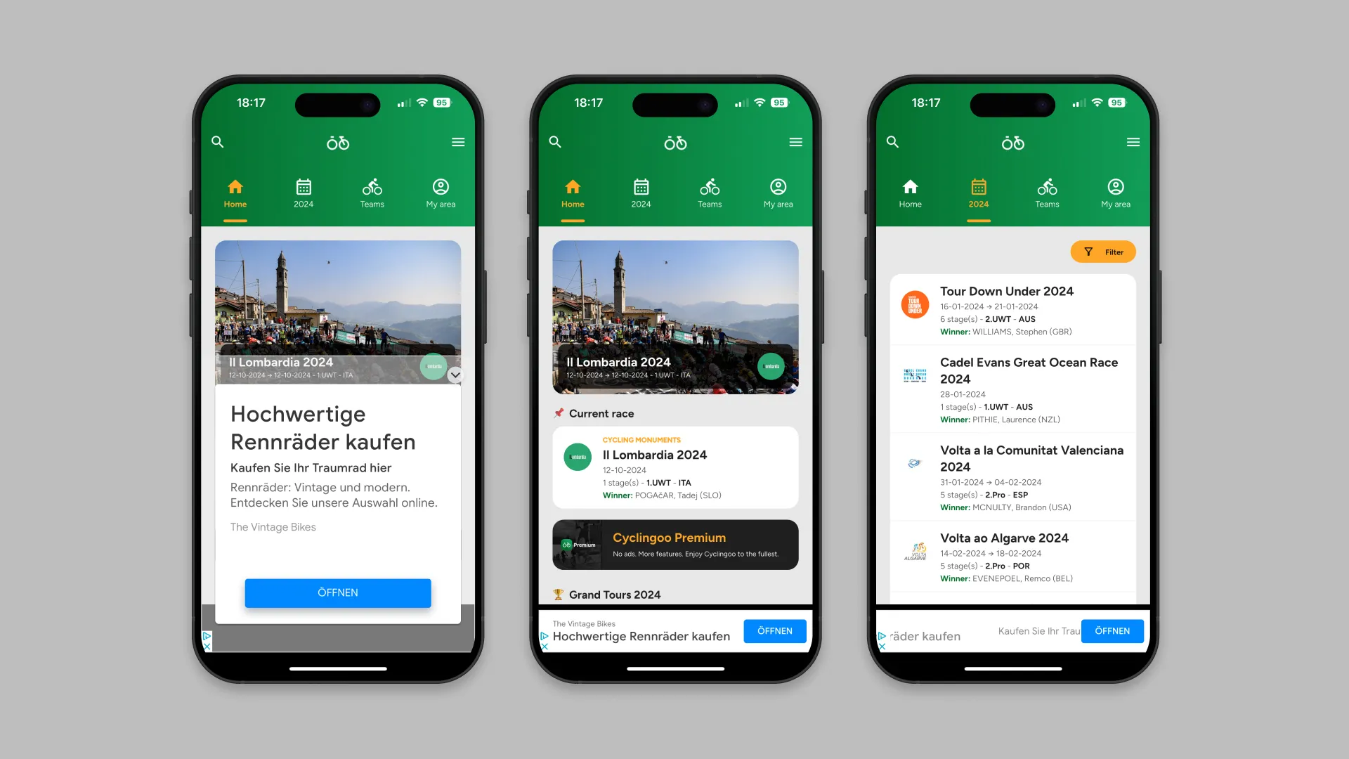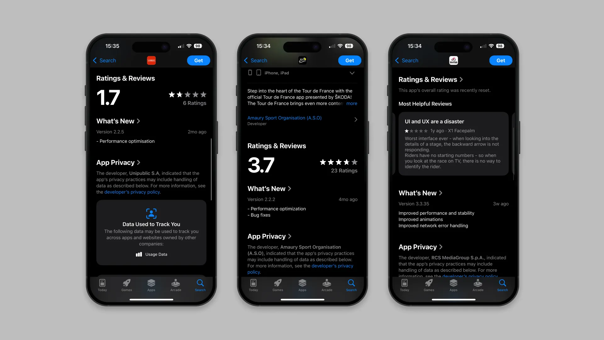Fragmentation: Three separate apps for Grand Tours, no unified experience.
