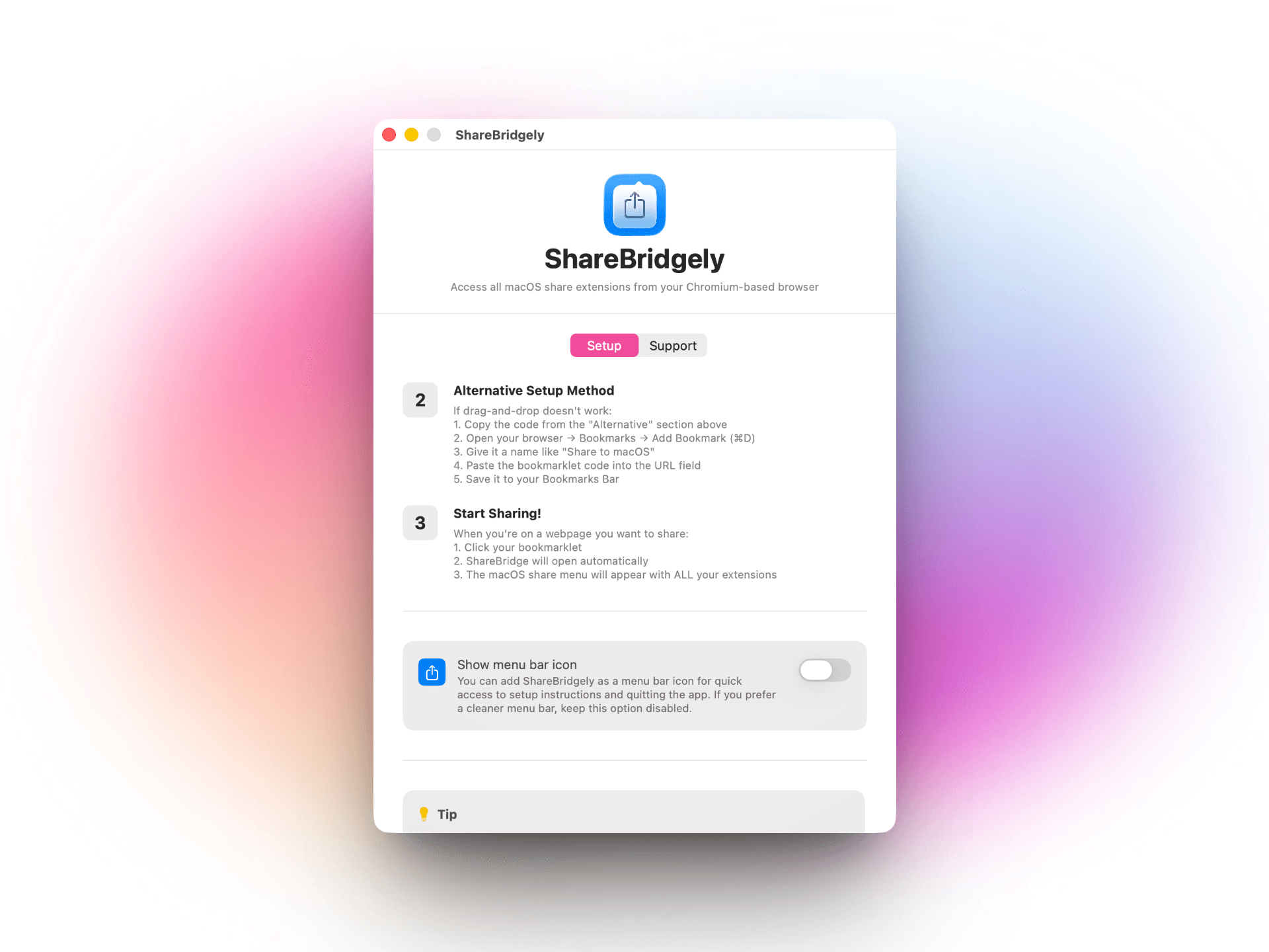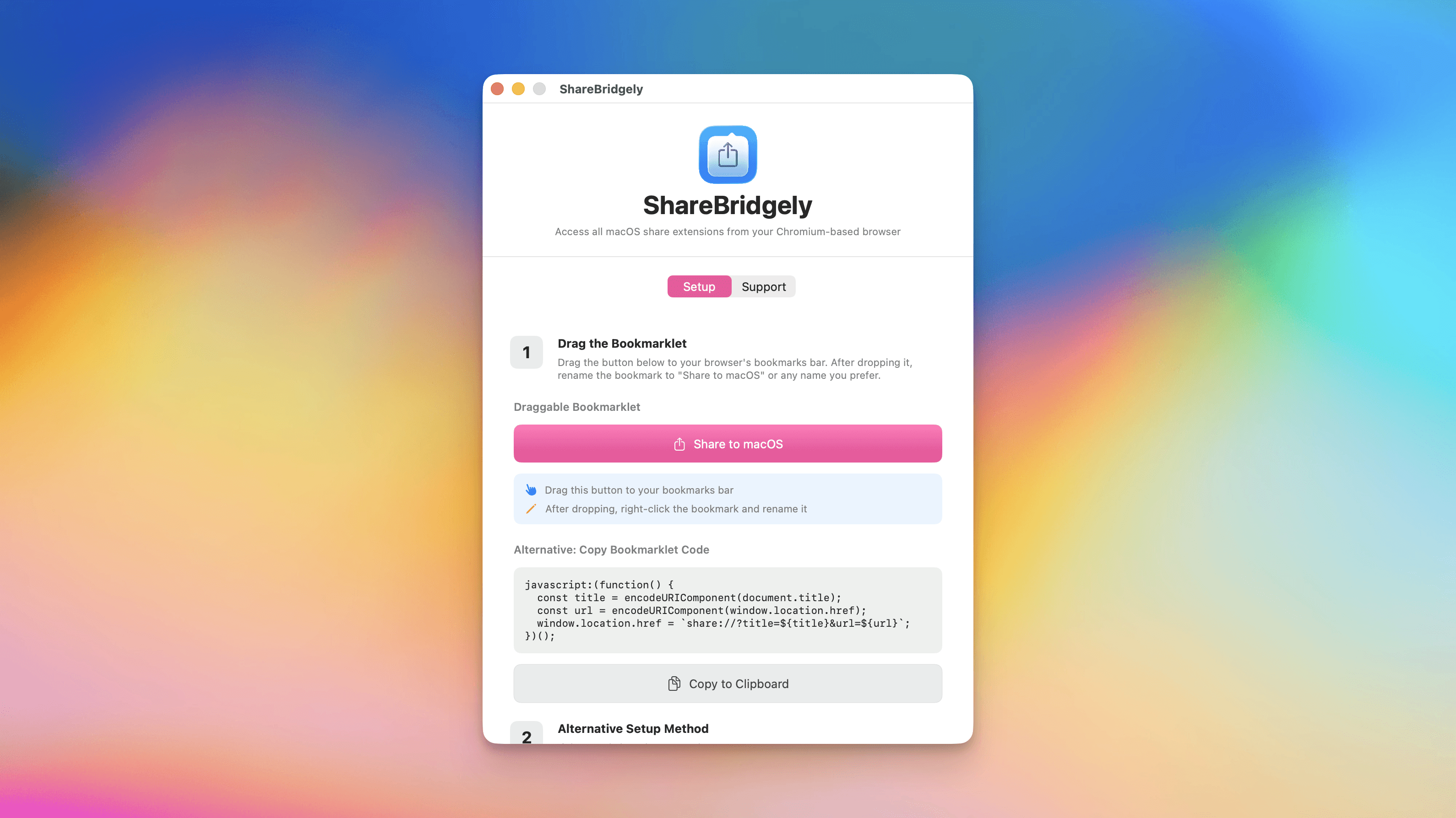 ShareBridgely provides a draggable bookmarklet for easy and straightforward setup in Chromium-based browsers. The bookmarklet encodes the page title and URL, then opens the app via the custom URL scheme. I added an optional menu bar icon for quick access to the setup instructions and app controls, which uses NSStatusItem and NSMenu for a lightweight, always-accessible interface.