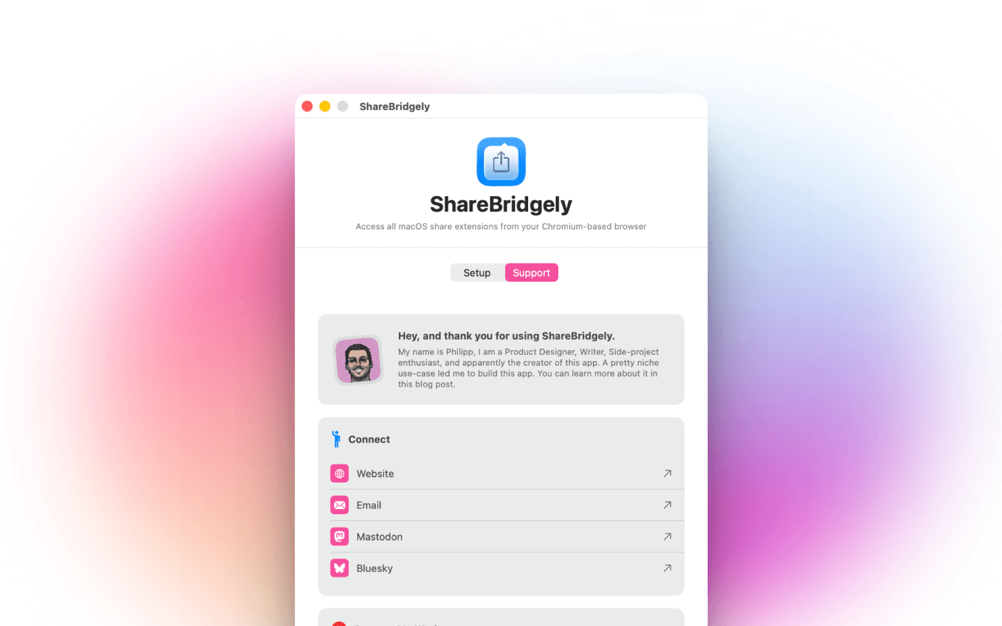 This gap inspired ShareBridgely, a lightweight macOS app designed to restore full access to macOS share extensions directly from Chromium-based browsers. With ShareBridgely, users can finally share links to their favorite apps, whether it’s saving to Reeder, adding to Raindrop.io, or sending to Bear, without switching browsers or resorting to workarounds.