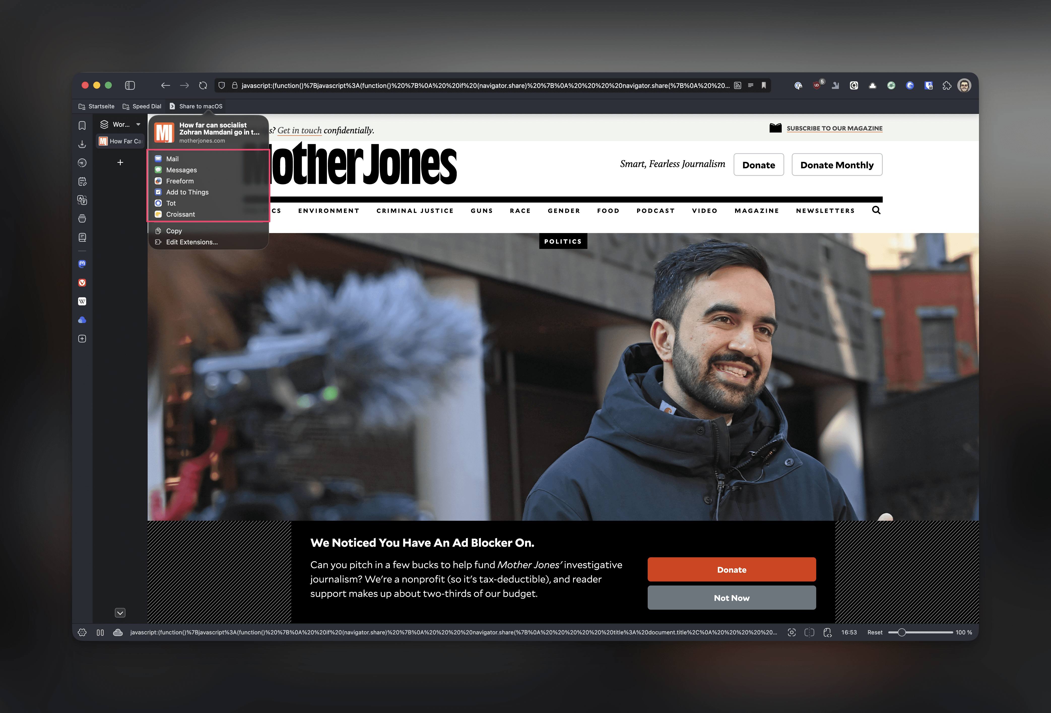 As Reeder is deeply integrated into the Apple ecosystem, the only way to save articles to Reeder is by using the share extension via the share sheet. So, here is the twist: I am using Vivaldi as my browser, which is powered by Chromium. Apparently, Chromium does not support access to the native share sheet on macOS. You know, that little share icon that sits next to the address bar in Safari? That is not available in Chromium. Other browsers like Opera built it on their own, but Vivaldi did not.